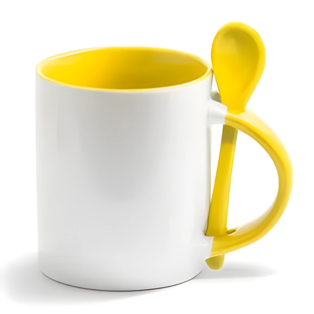 Caneca de Porcelana com Alça e Colher c/ Interior Colorido 325ml – Amarelo