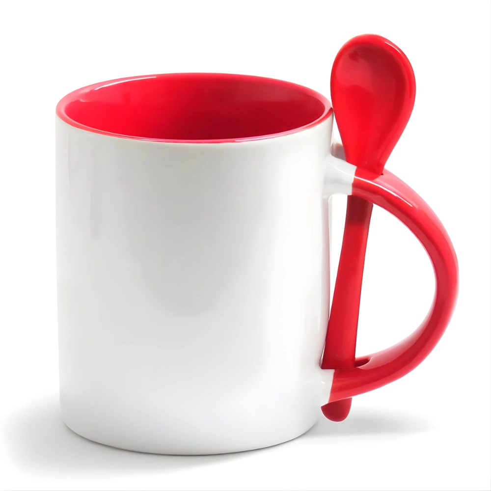 Caneca de Porcelana com Alça e Colher c/ Interior Colorido 325ml – Vermelho