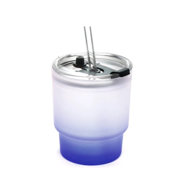 Copo de Vidro Jateado Azul Escuro para Sublimação com Tampa de Acrílico e Canudo de Vidro – 400ml
