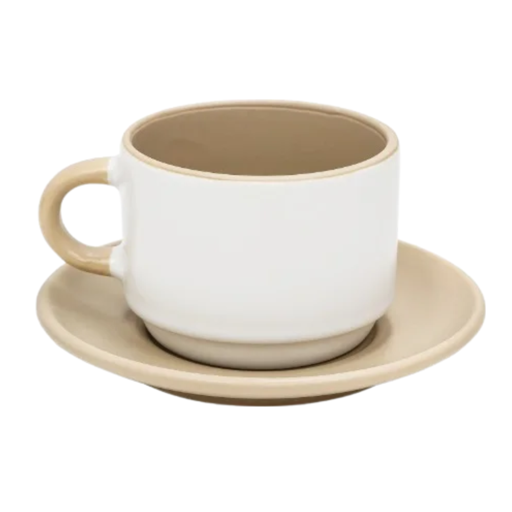 O modelo acompanha pires não resinados, mantendo um estilo mais natural e minimalista, ideal para quem busca um design mais limpo e elegante.